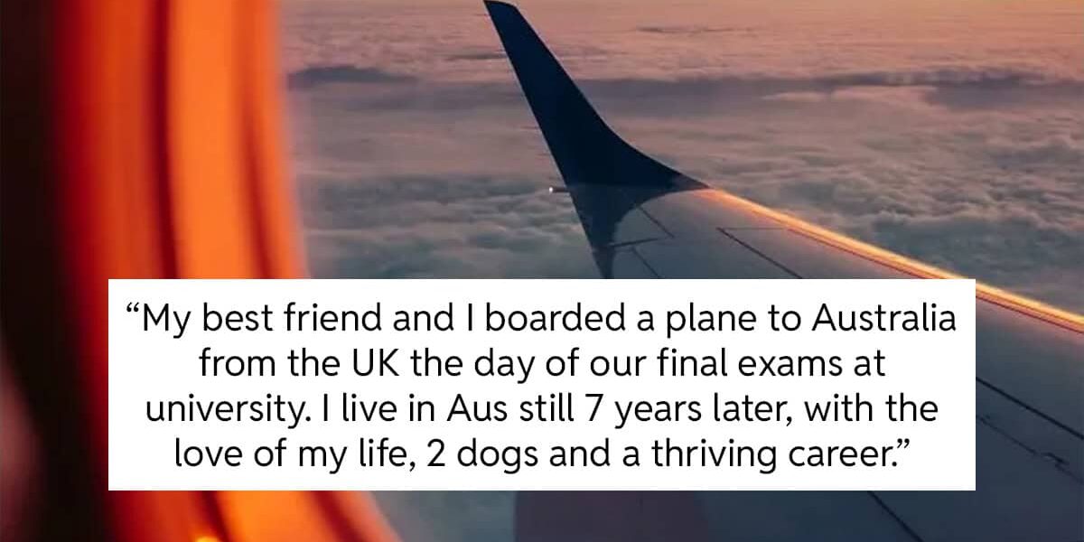 I suppose I did too. My best friend and I boarded a plane to Australia from the UK the day of our final exams at university. I live in Australia still 7 years later, with the love of my life, 2 dogs and a thriving career.